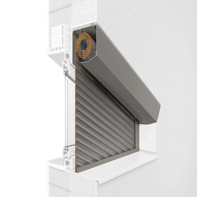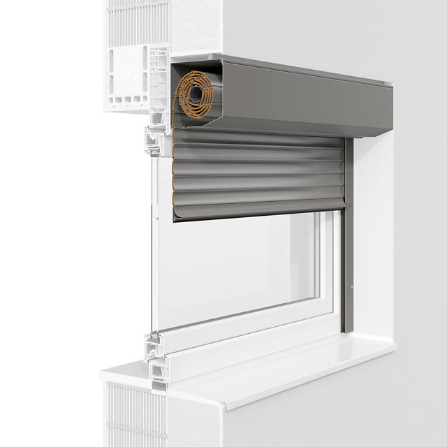 Das Rollladensystem passt sich in die Fassade ein und kann wahlweise mit eckiger oder fünfeckiger Frontblende verwendet werden.
